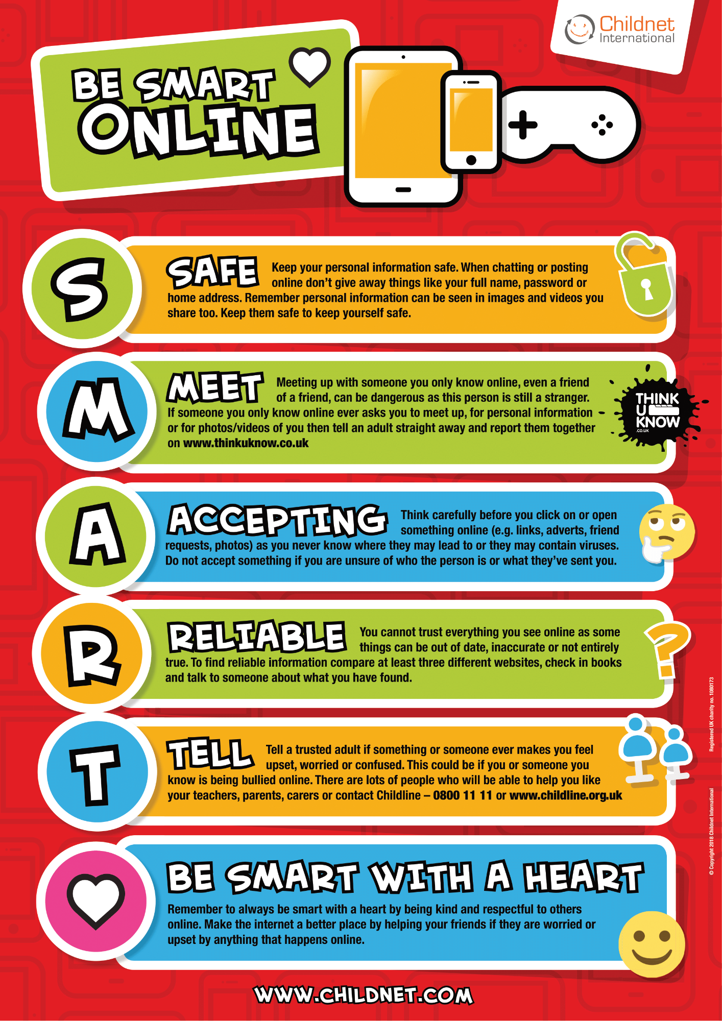 We are always talking to our children about helping themselves to stay safe online. We talk to them about the SMART rule and sharing ways to empower them to take responsibility for their online activity. Please see the poster for more information about this rule.